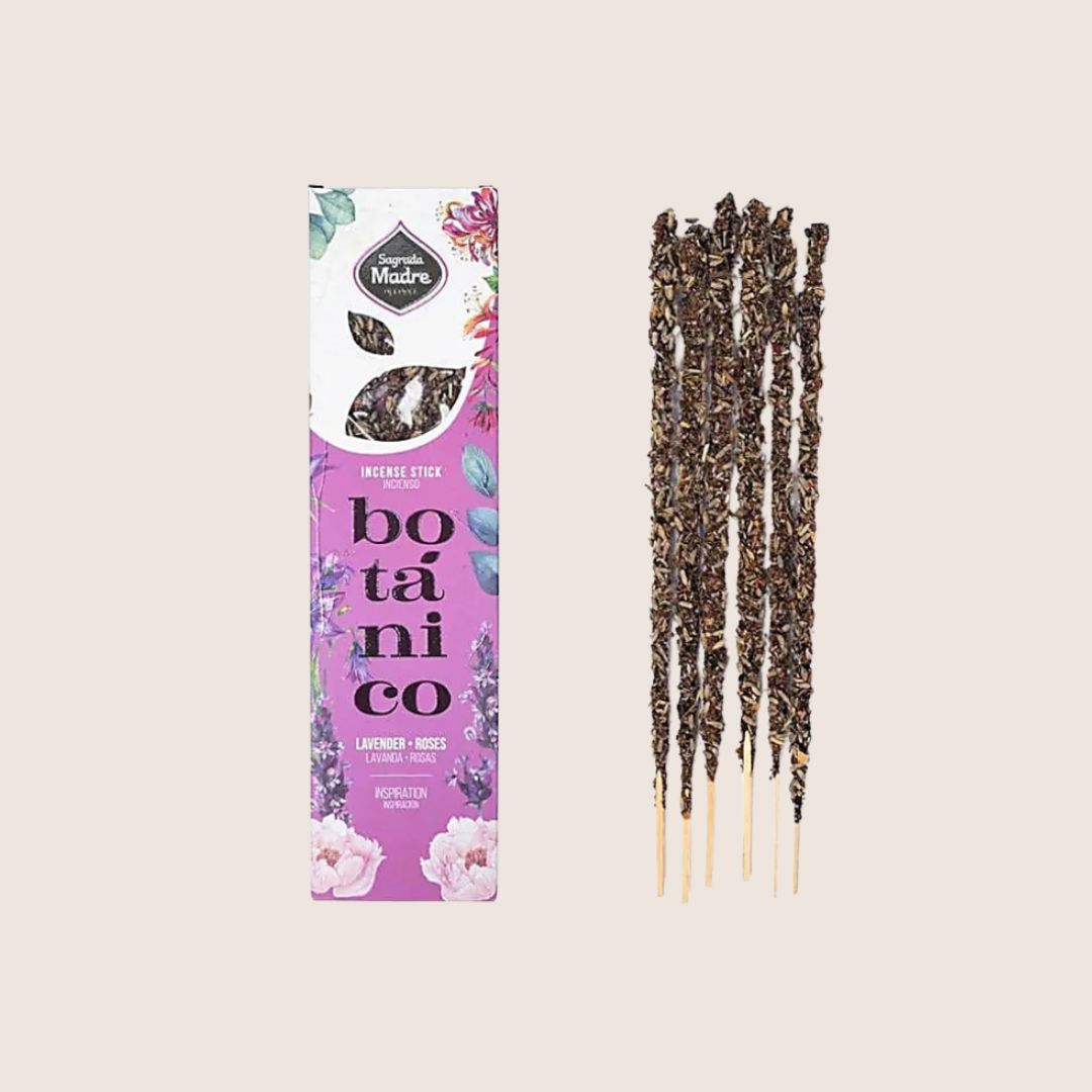 Botanischer Weihrauch von Sagrada Madre – handgefertigt in Argentinien aus 100 % natürlichen, botanisch angebauten Kräutern & Blüten. Lavendel wirkt beruhigend, löst Stress und fördert einen erholsamen Schlaf, während Rose die Herzenergie stärkt, Gefühle von Liebe & Mitgefühl unterstützt und die Stimmung hebt.
